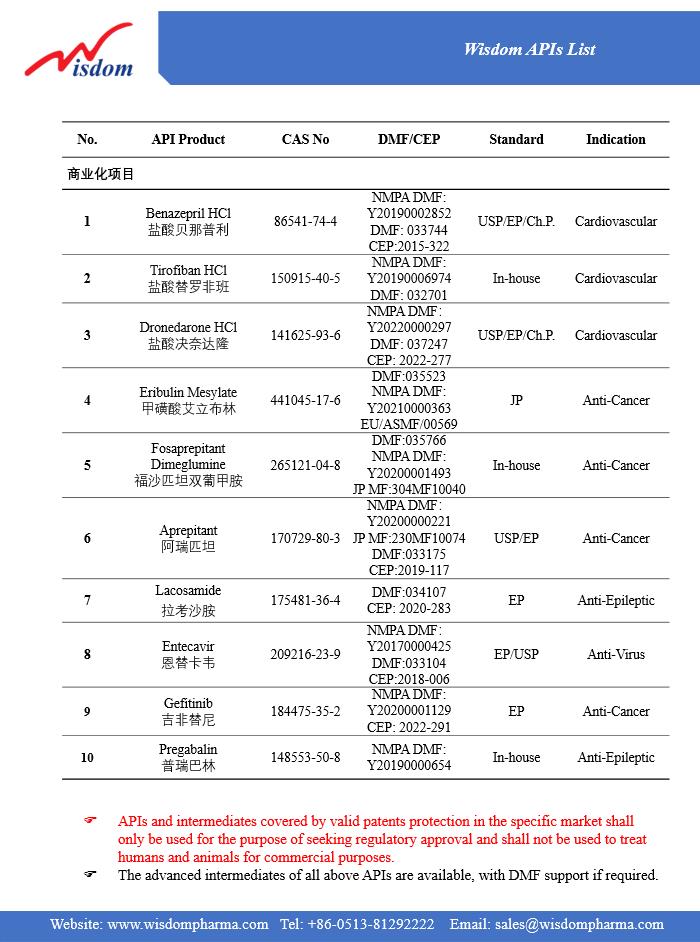 2 Benazepril HCl 86541-74-4 Validated USP/EP DMF: 025738 Cardiovascular