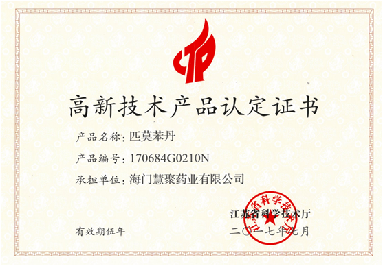 经组织申报、专家评审等程序,2017年江苏省第二批高新技术产品拟认定的2414项产品近日公示。新认定的2414项高新技术产品涉及电子、医药、光机电一体化、新材料、新能源等诸多领域,产品技术含量高,具有自主知识产权比重高。海门慧聚药业有限公司自主研发的匹莫苯丹获得江苏省高新技术产品称号,慧聚药业匹莫苯丹2016年获得欧盟的CEP,2017年可望获得新兽药证书。