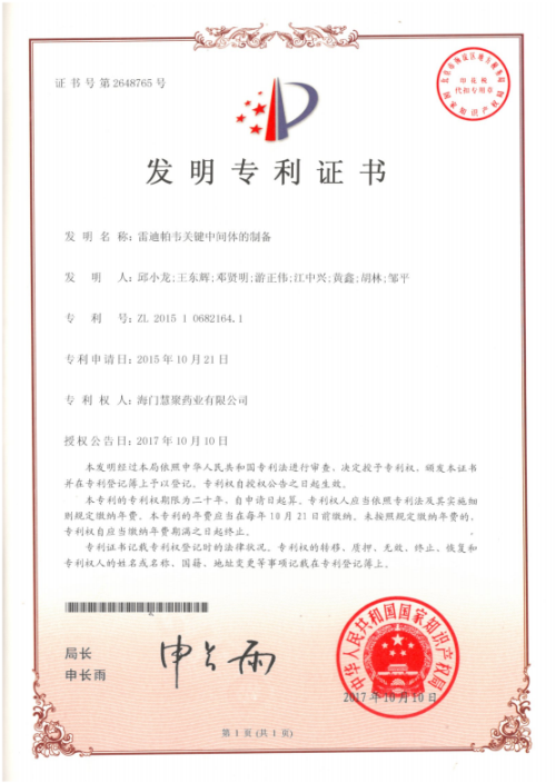 10月18日,由海门慧聚药业有限公司自主研发的“雷迪帕韦关键中间体的制备”,以其技术的国际领先性和产品的可靠性,被国家知识产权局授予“国家发明专利”,这是2017年度海门慧聚药业有限公司获得的第4项发明专利。