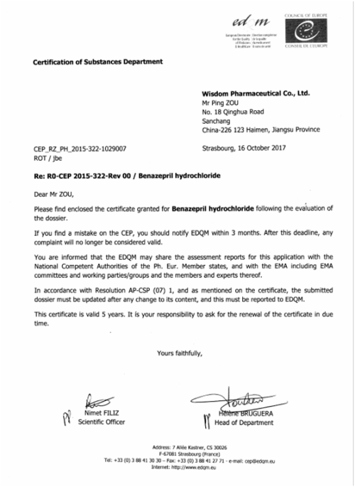 日前,海门慧聚取得原料药盐酸贝那普利CEP证书,这是继兽药匹莫苯丹之后又一产品取得的CEP证书。本次盐酸贝那普利(Benazepril hydrochloride)CEP证书的取得,标志着慧聚药业盐酸贝那普利(Benazepril hydrochloride)符合欧洲药品质量管理局(European Directorate for Quality Medicines)的产品质量要求,显示欧盟规范市场对该原料药质量的认可。