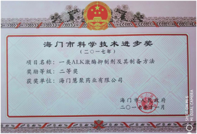 ALK激酶与肿瘤的发生、发展与转移密切相关,小分子ALK激酶抑制剂的研究与发现为肿瘤患者提供了新的治疗方法。我公司由邹总、邱博、胡林、曾祥军、吴忠平等组建的研发技术团队,攻克了一类ALK激酶抑制剂及其制备方法,经过海门市人民政府组织的科学技术评审委员会认定,获得海门市科学技术进步奖二等奖,向他们表示祝贺。