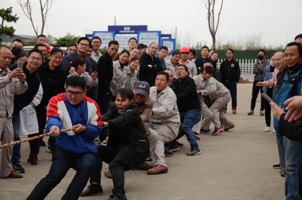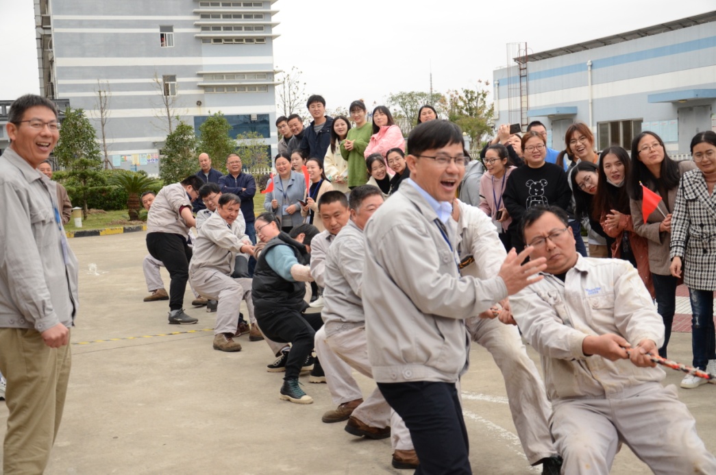 一、拔河比赛:楚河汉界、群雄争霸,谁更胜一筹?拔河比赛还没有开始,各队成员就跃跃欲试。有的脱外衣、有的换跑鞋、有的踢腿、有的弯腰,都在做热身准备。拔河比赛实行6对随机抽取两队比赛,赢的队伍再次两两比赛,直至决出冠军、亚军。拔河比赛共有6个队参赛,分别是生产一部、生产二部、工程部、分析部、研发系统、行政系统。拔河比赛最为激烈、精彩、热闹,加油声、笑声不绝于耳。尤其是生产二部,挑选了精兵强将、憋足了劲,比赛时每一个人似而后仰,用脚后跟抵地,似而前倾,用脚掌抵地,观战的人都为他(她)把心提到了嗓子口,鼓掌的人把手都拍红了,终于在大家的共同努力下得到了冠军。